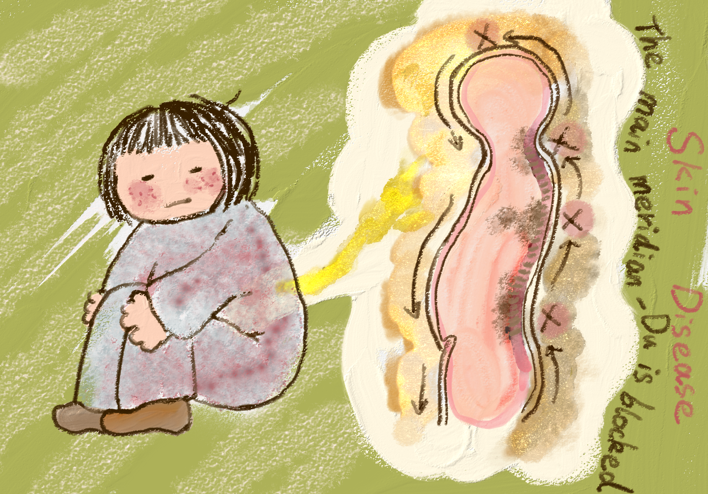 Acupuncture and moxibustion to open the Lung and Du meridians, clear stagnation, an detoxify the skin.
